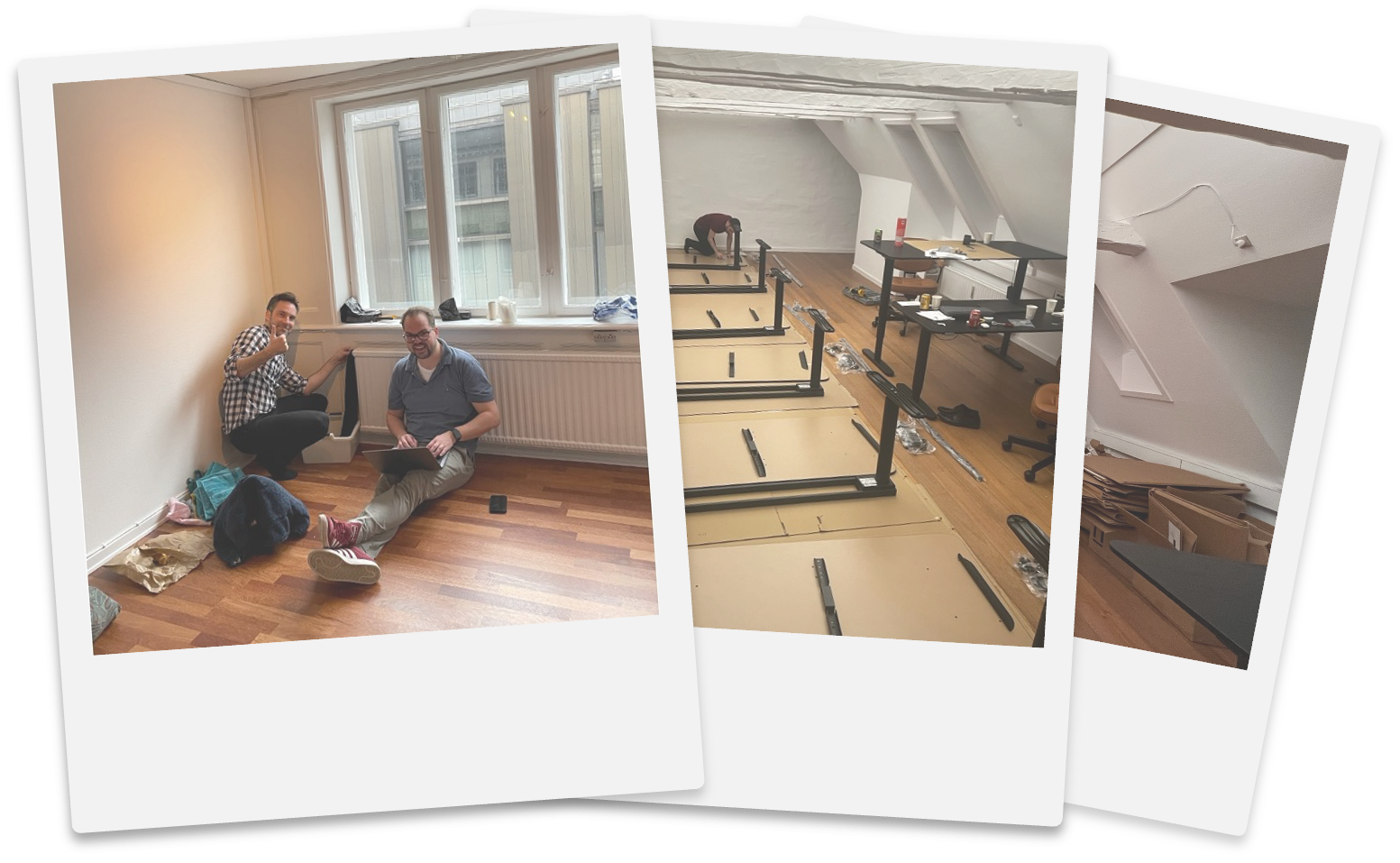 We got the keys to our very first office full of excitement - and within hours, full of water. On day one, a heater unit broke while Steffan was mid-meeting, and Daniel ended up burning his hands trying to hold back the flood until a plumber arrived. Two days later, our very first employee had her first day at work as Josefine joined another. For the first few weeks, things didn’t get much more glamorous: one desk, no chairs, and an old coffee machine doing its best to keep us alive. With no whiteboard, we sketched the outline of our very first proposal on the cardboard box from that single desk. The client never replied at the time — but, in true underdog fashion, we won the assignment eight months later. Eventually, we realized that sitting on the floor with laptops wasn't sustainable, so off we went to IKEA. Picking out sofas, desks, lamps, plants, and chairs felt like we were a newlywed couple moving in together, now debating our first shared interior style.